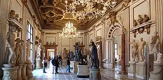 На площадках парадной лестницы размещены три мраморных античных рельефа (176 г. н. э.), посвящённых победам Марка Аврелия над германцами. В «Комнате Горациев и Куриациев» находится мраморная статуя Урбана VIII работы Джованни Лоренцо Бернини, а также статуя папы Иннокентия Х работы Алессандро Альгарди, стены украшены росписями и шпалерами.