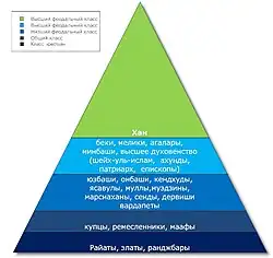 Население ханства делилось на два основных класса — феодалов и крестьян. А в городе Шуше преобладали ремесленники и купцы. К феодалам относились хан, мелики, беки, агалары, минбаши, юзбаши, кендхуды, ясавулы и высшее духовенство. Со слов Мирза Джамала выясняется, что беки в ханстве делились на три группы. В первую входили все те, кто имел непосредственное отношение к семье правителя: братья хана и их дети, ханские дети и двоюродные братья хана[93]. Во вторую группу входили беки, получившие это звание грамотами (талигами) гарабагских ханов с пожалованием им сел, магалов, меликств и др. В третью группу входили беки, временно или наследственно управляющие непосредственно подвластными хану административно-хозяйственными единицами, без каких-либо пожалованных грамот. Сюда относились также и личные беки, получившие своё звание за службу при хане без пожалования в их управление сел и оймагов. Беки, относящиеся к первой и второй группам, стояли по иерархии выше беков из третьей группы.