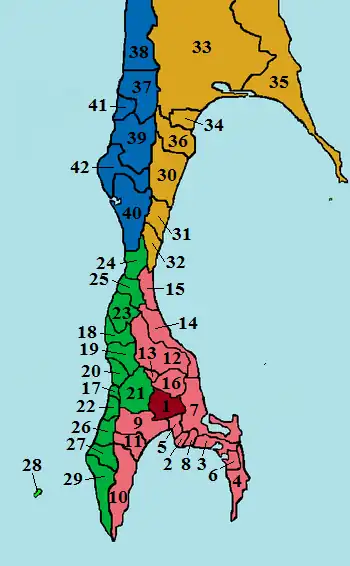 К 1945 году губернаторство Карафуто было поделено на 4 округа (яп. 支庁 ситё:), 10 уездов (яп. гун) и 42 муниципалитета: 1 город (яп. си), 14 посёлков (яп. мати) и 27 сёл (яп. мура).