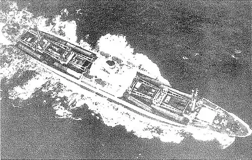 Турбоход «Физик Курчатов», одно из судов типа «Ленинский комсомол», в порту Касильда. На причале видна тень от F-101 «Вуду», самолёта-разведчика, сделавшего снимок