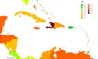 | Малые страны Карибского бассейна | 73,03 | 69,82 | 76,36 | 6,54 | 71,26 | 0,56 | 71,82 | −0,19 | 71,63 | −2,23 | 69,40 | 3,21 | 72,61 | 0,42 | 73,03 | 1,22 | 1,77 |