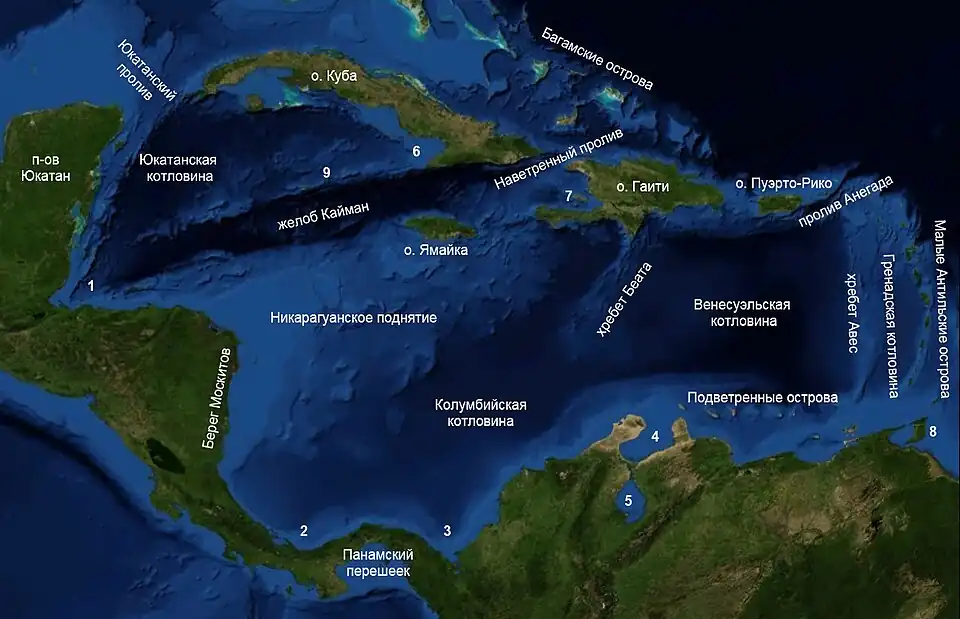 | Цифрами обозначены: 1. Гондурасский залив 2. залив Москитос 3. Дарьенский залив 4. Венесуэльский залив 5. озеро Маракайбо 6. Гуаканаябо 7. залив Гонав 8. остров Тринидад 9. Каймановы острова (При нажатии на какай-либо из изображённых географических объектов, будет осуществлён переход на соответствующую статью.) |