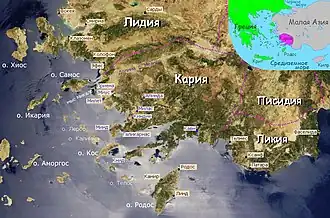 - ↑ Bienkowski & Millard, 2000: «Caria, Carians A region of south-west Turkey, south of *Lydia, Caria was first settled in the *Neolithic but became a distinctive culture only in the first millennium BC. Carians may originally have been of *Aegean origin and settled in the area in the second millennium BC. The earlier first-millennium BC communities seem to have been independent, mainly *temple centres for native deities, and Caria came under Lydian control. There was considerable *Hellenistic influence, and already the *pottery of the eighth and seventh centuries BC had a geometric tradition similar to that of east Greece. In 546 BC, Caria was brought under *Persian rule and placed under the Lydian satrapy. By the fourth century BC, its culture was similar to that of a *Greek city-state. The Carian *language is related to Luwian (*Hittite) and is known from inscriptions written in a local form of the Greek *alphabet discovered in Caria and others in Egypt by Carian mercenaries.»