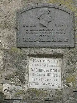 - Мемориальная доска на башне № 11 (Папская башня, башня Кармелюка) Каменец-Подольской крепости, Хмельницкая область, город Каменец-Подольский — 48°40′22″ с. ш. 26°33′49″ в. д.