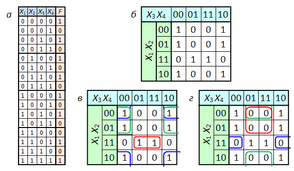 В данном разделе в качестве примера используется функция четырёх переменных, заданная таблицей истинности, изображённой на рис. 2а. Карта Карно для той же функции изображена на рис. 2б.