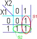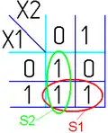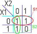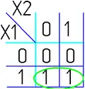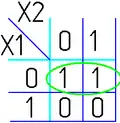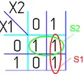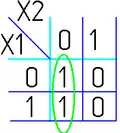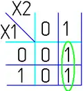 - Одна ячейка карты Карно может входить сразу в несколько областей. Это следует из очевидного свойства булевых функций: повторение уже существующего слагаемого (сомножителя) не влияет на функцию: