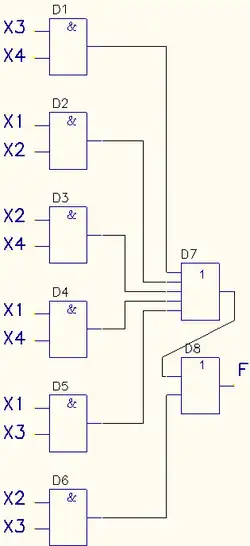 На рисунке показано цифровое устройство F с четырьмя двоичными входными сигналами . Входными сигналами могут быть показания датчиков, работающих на замыкание и следовательно имеющих только два значения — «включено» (1) и «выключено» (0). Предположим, что в силу особенностей конструкции устройства 2-й и 4-й датчики не могут сработать одновременно, то есть сочетание сигналов физически невозможно. В этом случае значение функции в четырёх клетках карты Карно не имеет значения, что условно показано символом «×».
