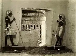 В период работы в Службе древностей у Г. Картера были и собственные археологические открытия. Ещё работая в Дейр-эль-Бахри в ноябре 1898 года, он заподозрил существование большой гробницы, но смог вернуться к ней только в весенний и осенний сезоны 1900 года. Работы велись на средства, предоставленные неназванным спонсором. В погребальной камере, открытой 31 декабря 1900 года, нашлись только три грубые деревянные ладьи и керамика. Масперо сообщал, что Картер был слишком уверен в себе и пригласил на открытие генерального консула Великобритании лорда Кромера. Лишь много лет спустя гробница была идентифицирована как кенотаф Ментухотепа II[41]. После 1900 года Картер попытался сделать своим постоянным спонсором американского юриста Теодора Дэвиса, который уже финансировал раскопки Ньюберри в гробницах частных лиц. Дэвисом были открыты гробница KV45 и ящик с кожаными набедренными повязками в гробнице KV36[42].