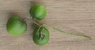 Плод — многосемянная, тёмно-зелёная, ядовитая ягода диаметром 2 см, по форме напоминающая маленький помидор.