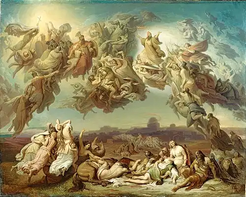 Битва на Каталаунских полях (в литературе также часто встречается название Би́тва наро́дов[2][3], фр. Bataille des champs Catalauniques; нем. Völkerschlacht auf den katalaunischen Gefilden[4][5]) — состоявшееся после 15 июня 451 года сражение в Галлии, в котором войска Западной Римской империи под началом полководца Аэция в союзе с армией Тулузского королевства вестготов временно остановили нашествие коалиции племён гуннов и германцев под началом Аттилы на Галлию. Через год Аттила пошёл уже на Рим, что завершилось разграблением северо-италийских городов, вспышкой эпидемии в войсках гуннов и отступлением на свои территории.