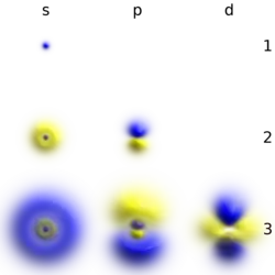 Некоторые волновые функции описывают распределения вероятностей, которые не зависят от времени, такие как собственные состояния гамильтониана. Многие динамические системы, рассматриваемые в классической механике, описываются такими «стационарными» волновыми функциями. Например, один электрон в невозбуждённом атоме классически изображается как частица, движущаяся по круговой траектории вокруг ядра атома, тогда как в квантовой механике он описывается стационарной волновой функцией, окружающей ядро[87]. Например, волновая функция электрона для невозбуждённого атома водорода представляет собой сферически симметричную функцию, известную как s-орбиталь[88].