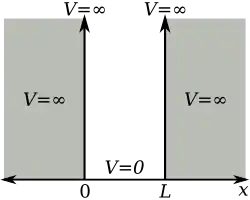 Частица в одномерном потенциале с бесконечными стенками является математически наиболее простым примером, где ограничения приводят к квантованию энергетических уровней. Ящик определяется как потенциал, задающий для частицы нулевую потенциальную энергию везде внутри определённой области и бесконечную потенциальную энергию повсюду за пределами этой области[99]. Для одномерного случая вдоль оси независимое от времени уравнение Шрёдингера можно записать в виде