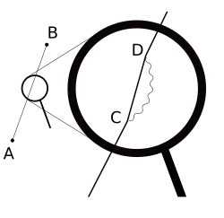 Фейнман заменяет комплексные числа вращающимися стрелками, которые начинаются при испускании и заканчиваются при обнаружении частицы. Сумма всех полученных стрелок представляет собой общую вероятность события. На этой диаграмме свет, излучаемый источником S, отражается от нескольких сегментов зеркала (отмечен синим цветом), прежде чем достигнет детектора в точке P. Необходимо учитывать сумму всех этих путей. На приведённом ниже графике показано общее время, затраченное на прохождение каждого из указанных выше путей.
