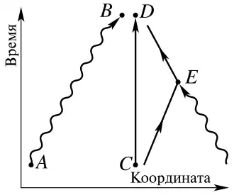 Электрон перемещается из одного положения в пространстве и времени в другое.