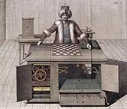 Ещё больше внимания привлек к себе так называемый шахматный автоматон Кемпелена, который, как впоследствии обнаружилось, был основан на иллюзионе. Автоматон имел вид комода, на котором была расположена шахматная доска. За доской находилась механическая фигура, одетая турком, искусно игравшая в шахматы. В конце XVIII века и в первых двух десятилетиях XIX века машина служила поводом к спорам многих учёных, пытавшихся объяснить это чудо механики. Теперь достоверно известно, что в ящике его, под шахматной доской, постоянно скрывался достаточно сильный шахматный игрок. Автомат сгорел 5 июля 1854 года в Филадельфии. Известно, что «автомат» победил в шахматы Фридриха II, а в 1809 году Наполеона, существует запись партии, которая соотносится с данным событием[5].