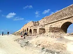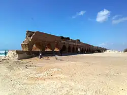 - Первая линия была построена до 66 года н. э., вероятно, во времена Ирода (I век до н. э.) или римских наместников: она доставляла в город воду из источников Шуни, находившихся в 7 км к северо-востоку от Кесарии, возле современной Биньямины. Акведук опирался на систему арок и хорошо сохранился до наших дней; на подходах к городу с севера, он пересекал небольшую гряду из песчаника по специально прорубленному в породе небольшому туннелю. Конечный участок первой линии шёл параллельно морю и входил в город с севера. На этом участке водный канал акведука был закрыт сверху каменным потолком-сводом, видимо, для того, чтобы ветер не засорял воду прибрежным песком.