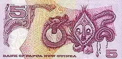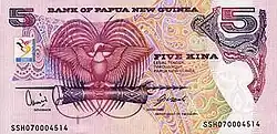 5 | 145×73 | фиолетовый | Парламент Папуа — Новой Гвинеи, герб Папуа — Новой Гвинеи (изображение райской птицы, сидящей на кунду (новогвинейском барабане) и церемониальном копье). | Изображения традиционных денег Папуа — Новой Гвинеи: маска хомбули с региона Сепик, кина (ожерелье из ракушек), ожерелье из ракушек из провинции Новая Ирландия. | 2008 |