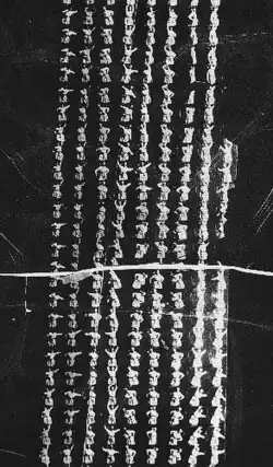 Первый работоспособный вариант аппарата использовал расположенную горизонтально киноплёнку шириной 19-мм с одним рядом перфорации, расположенным по центру между кадрами. Зубчатый барабан с приводом от электродвигателя непрерывно перемещал её мимо объектива, который строил кадр круглой формы. Свет прерывался дисковым обтюратором с круглыми отверстиями, выполнявшими роль фотозатвора[9][10]. В результате на полученных фотографиях фиксировались отдельные фазы движения.