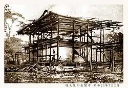 2 июля 1950 года 21-летний монах-ученик Хаяси Дзёкан (яп. 林承賢, はやしじょうかん Хаяси Дзё:кан) совершил поджог Золотого павильона, пытаясь покончить жизнь самоубийством. Монаха удалось спасти, но павильон со всеми сокровищами сгорел[7]. Мать Хаяси наложила на себя руки, не выдержав бесчестного поступка сына, а сам Хаяси был приговорён к 7 годам заключения и умер 7 марта 1956 года от туберкулёза и психических расстройств. В литературной обработке свою версию этого события написал Юкио Мисима в книге «Золотой храм», которая вышла в 1956 и была переведена на русский язык Григорием Чхартишвили в 1993-м году. Также эта трагедия вдохновила Мидзуками Цутому на написание рассказа «Золотой храм в пламени» («Кинкау Эндзё»).