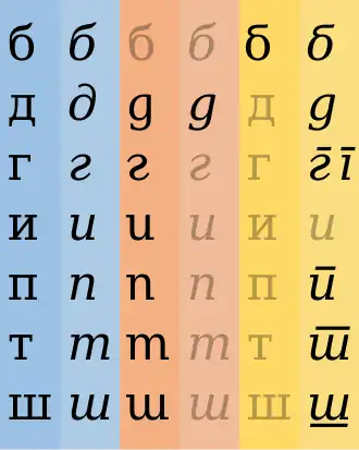 - ↑ Кириллица // Казахстан. Национальная энциклопедия. — Алматы: Қазақ энциклопедиясы, 2005. — Т. III. — ISBN 9965-9746-4-0. (CC BY-SA 3.0)
