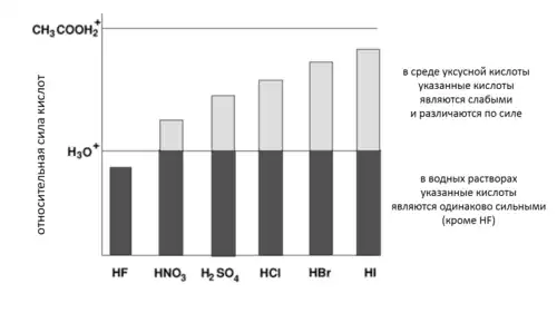 Если растворитель обладает основными свойствами, то в нём все кислоты становятся более сильными и большее число кислот нивелируется по силе (например, в аммиаке уксусная кислота диссоциирует нацело, хотя в водных растворах она имеет среднюю силу). Напротив, если основные свойства растворителя понижаются, то сильные кислоты могут стать слабыми, а число нивелированных кислот понижается[26]. Например, уксусная кислота служит нивелирующим растворителем для хлорной кислоты HClO4, диссоциирующей в ней нацело, и для хлороводородной кислоты HCl, и для серной кислоты H2SO4, являющихся в уксусной кислоте слабыми[27].