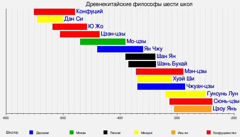 - ↑ Следует учитывать, что традиция членения на «школы» цзя 家 восходит к Сыма Таню, который ок. 110 до н. э. впервые выделил указанные шесть направлений. Это разделение отнюдь не выступало жестким ограничением при взаимодействии различных интеллектуальных традиций.