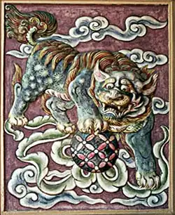 | Суань-ни (кит. 狻猊, пиньинь suānní) | Суаньни любит сидеть, и поэтому его обычно помещают сидящим у ног Будды или бодхисатвы[2]; | |