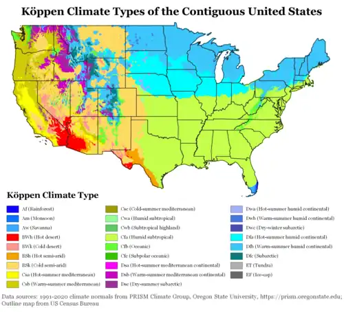 Из-за большого размера страны, её протяжённости и широкого разнообразия географических особенностей — на территории США можно найти районы с практически любыми климатическими характеристиками. Бо́льшая часть США (северная и центральная часть США) располагается в зоне умеренного климата, в южной части США преобладает субтропический климат, Гавайи, южная часть Флориды и крайняя южная часть Техаса лежат в зоне из тропиков. Север Аляски относится к полярным регионам, а в остальной части Аляски преобладает субарктический климат. Великие равнины к западу от 100-го меридиана относят к полупустыням, Большой Бассейн и области вокруг него имеют аридный, а прибрежные районы Калифорнии — средиземноморский климат. Тип климата в границах одного пояса может существенно меняться в зависимости от рельефа, близости океана и других факторов. Благоприятный климат оказал немалое влияние на заселение материка европейцами и во многом способствовал занятию США лидирующих позиций в мире.