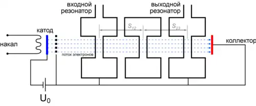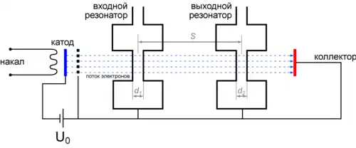 В клистроне имеются два объёмных резонатора с ёмкостными сеточными зазорами. Первый резонатор называют входным, или модулятором, второй — выходным. Пространство между ними называют пространством дрейфа или группирования.