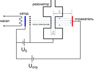 В отражательном клистроне используется один резонатор, через который электронный поток проходит дважды, отражаясь от специального электрода — отражателя.