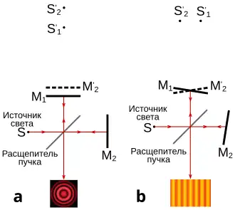 Формирование интерференционной картины в интерферометре Майкельсона для двух конфигураций, а) когда зеркала строго перпендикулярны и b) нестрого. Происходит интерференция от двух мнимых изображений источника.