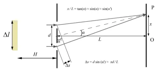 При этом разность путей при прохождении света от точки источника до каждой из щелей вычисляется так же, как и в опыте Юнга , где y — координата точки на источнике.