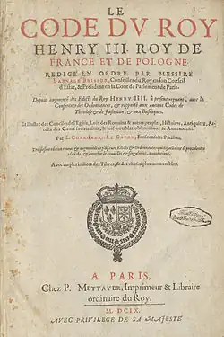 В конце XVI века по распоряжению короля Генриха III Валуа президент Парижского парламента Барнабе Бриссон предпринял попытку составить сборник кутюмов и королевских ордонансов, классифицировав их по предмету правового регулирования. Этот обширный документ, опубликованный в 1587 году, впоследствии стал известен как Кодекс короля Генриха III. Однако гибель короля в 1589 году, а затем и смерть самого Бриссона в 1591 году помешали официальному введению кодекса в действие[19][20].