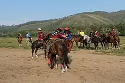 - В одной команде участвует от 8 до 12 всадников и от 8 до 12 лошадей, но одновременно в игру вступают только по четыре джигита от каждой команды. Участники имеют право меняться и даже менять своих коней. Команде, выпустившей в поле незаявленного игрока или лошадь, засчитывается поражение;