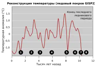 - ↑ Alley, R. B.; et al. Holocene climatic instability; a prominent, widespread event 8,200 yr ago (англ.) // Geology : journal. — 1997. — Vol. 25, no. 6. — P. 483—486. — doi:10.1130/0091-7613(1997)025<0483:HCIAPW>2.3.CO;2. Архивировано 28 сентября 2011 года.