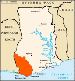 1 января 1683 года майор Отто Фридрих фон дер Грёбен (Otto Friedrich von der Gröben) с фрегатами Morian и Chur Prinz высадился на побережье современной Ганы и основал колонию Гросс-Фридрихсбург (нем. Groß Friedrichsburg). После переговоров с главами 14 местных племён был подписан договор, согласно которому они переходили под протекторат Бранденбурга[2]. В следующие годы были построены также два форта (Dorothea и Louise), также небольшое укрепление возле Такоради. Однако попытки продвинуться дальше вглубь континента были остановлены ожесточённым сопротивлением владевшей этими землями голландской колонии. Тем не менее, торговля драгоценными металлами и рабами процветала. После особо удачного 1689 года Фридрих Вильгельм смог выкупить доли компаньонов в компании и стать её единственным владельцем. В 1718 году колония была продана голландской Вест-Индской компании[6]. После отъезда из колонии последнего бранденбуржца, командование крепостью перенял Ян Конни (Jan Conny). Он отказался передавать крепость голландцам и до своей капитуляции в 1724 году успешно отражал все их атаки[7][8].