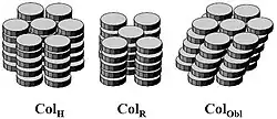 - ColObl — Колоны собраны в центрировано гексагональную сетку, но молекулы сдвинуты в сторону