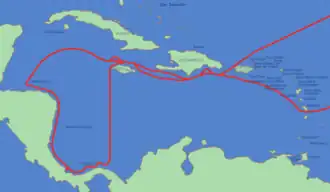 - 6 декабря 1492 года — открыт остров Гаити, который Колумб назвал Эспаньолой, потому что его долины показались ему похожими на земли Кастилии. Продвигаясь вдоль северного берега, испанцы открыли остров Тортуга.