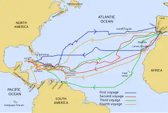Колумб первым из достоверно известных путешественников пересёк Атлантический океан в субтропической и тропической полосе Северного полушария и первым из европейцев ходил в Карибском море и в Саргассовом море[3]. Он открыл Южную Америку и Центральную Америку и положил начало их исследованию, включая континентальные части и близлежащие архипелаги — Большие Антильские (Куба, Гаити, Ямайка и Пуэрто-Рико), Малые Антильские (от Доминики до Виргинских островов, а также Тринидад) и Багамские острова.