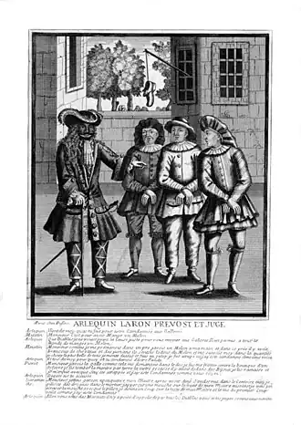 Первые известные гастроли во Франции были отмечены в 1571 году, когда труппа актёра Джан Ганассы в течение полугода давала представления при дворе короля Карла IX[12]. Нигде влияние комедии не было столь велико, как во Франции. Там, где традиции фарса очень сильны, где уже был написан «Гаргантюа и Пантагрюэль», элита свободно говорила по-итальянски, а крестьянство и горожане без труда его понимали, комедия, или, как её стали здесь называть, импровизированная комедия (фр. comédie à l'impromptu[13]) была принята и получила развитие в виде ярмарочного театра (фр. théâtre de la foire). Французские актёры часто не носили масок, а только белили лицо муко́й (т. н. барбулье́); и даже игравшие классических персонажей актёры парижского Театра итальянской комедии предпочитали иногда играть без масок, как прославленный Арлекин, Анджело Константини (Меццетино). Некоторые персонажи итальянской комедии были изменены: так, Пульчинелла превратился в Полишинеля, а Педролино — в Пьеро. Сюжет ярмарочных спектаклей был примитивнее итальянских и часто нёс исключительно служебную функцию — подготавливал и связывал многочисленные выходы акробатов, эквилибристов и танцоров[14], в них было меньше импровизации.