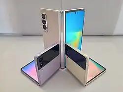 В феврале 2019 года Samsung представила свой первый складной смартфон, Samsung Galaxy Fold (диагональ основного экрана в развёрнутом состоянии 7,3 дюйма, плюс дополнительный дисплей с диагональю 4,6 дюйма[10]. Однако за несколько недель до начала продаж журналисты, которым выдали смартфоны на обзор, сообщили о выходе из строя устройств после снятия защитной плёнки[11]; в результате компания Samsung отменила начало продаж по всему миру, запланированное на 26 апреля 2019[12]. В 2023 году вышел Samsung Galaxy Z Fold 5. Подобные смартфоны стали распространёнными, но из-за низкого соотношения цена/качество остались нишевым продуктом[13][14].