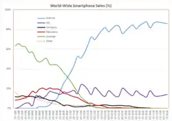 Статистика продукции смартфонов по доле операционных систем (начиная с 2005 года)[16][17][18][25][26]: