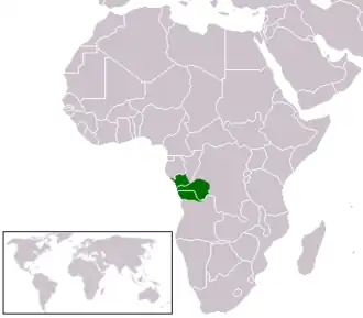 Ареал распространения языка. Тёмно-жёлтый цвет — собственно конго, светло-жёлтый — китуба