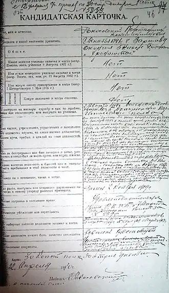 - В «Кандидатской карточке», датированной 22 апреля 1920 года К. Рокоссовский указал дату рождения — 8 (20) декабря 1896 года и место рождения — город Варшава, который был административным центром Варшавской губернии и Варшавского генерал-губернаторства, ныне — столица Республики Польша[15][16].