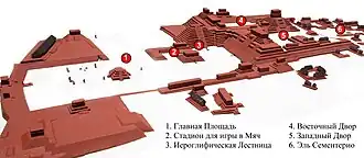Кроме великолепных стел, возведённых в честь 15-го двадцатилетия царём Вашаклахун-Убах-К’авилем в 731 г. и изображающих самого царя, его предков, а также богов-хранителей долины (известной в древности как Хушвинтик), внимание посетителей Главной Площади привлечет стадион для игры в мяч, украшенный изображениями попугаев-ара, а также величественная иероглифическая лестница, заложенная при Вашаклахун-Убах-К’авиле, перестроенная и увеличенная при 15 царе, К’ак'-Йипйах-Чан-К’авиле. Эта лестница — самая длинная известная нам надпись на памятниках древних майя (около 2 страниц печатного текста латиницей). К сожалению, только первые 15 из 63 ступеней лестницы были найдены в своём первоначальном состоянии, тогда как остальные были восстановлены археологами Института Карнеги в полном беспорядке.
