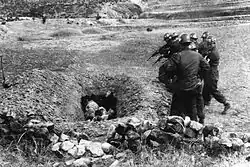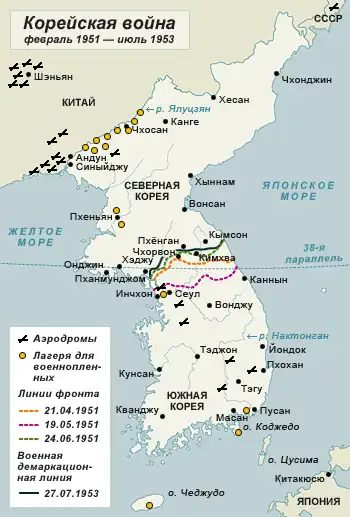 Корейская война — война между Северной частью Корейского полуострова и Южной частью Корейского полуострова с 1950 по 1953 год. Война началась 25 июня 1950 года, когда Северная Корея вторглась в Южную Корею после столкновений на границе и восстаний в Южной Корее[a][31][32]. Северную Корею поддерживали Китай (Китайская Народная Республика) и Советский Союз, а Южную Корею — Соединённые Штаты Америки и союзные страны (как единые силы ООН во главе с США). Боевые действия закончились соглашением о перемирии 27 июля 1953 года, без подписания мирного договора (из-за чего конфликт формально продолжается по сей день).