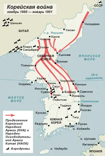 После первых двух месяцев войны южнокорейская армия и американские войска, спешно переброшенные в Корею, оказались на грани поражения, отступив на небольшой участок за оборонительной линией, известной как Пусанский периметр. В сентябре 1950 года в Инчхоне было начато рискованное десантное контрнаступление Организации Объединённых Наций, отрезавшее войска и пути снабжения Корейской народной армии в Южной Корее. Те, кто избежал окружения и плена, были вынуждены вернуться на север. Силы Организации Объединённых Наций вторглись в Северную Корею в октябре 1950 года и быстро двинулись к реке Ялуцзян — границе с Китаем, — но 19 октября 1950 года китайские войска Народной добровольческой армии пересекли Ялуцзян и вступили в войну[33]. Организация Объединённых Наций отступила из Северной Кореи после первого этапа наступления и второго этапа наступления. К концу декабря китайские войска находились в Южной Корее.