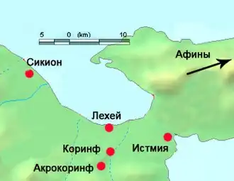 Приблизительно в это же время вспыхнула партийная борьба в Коринфе между демократической и олигархической партиями. Демократы, поддержанные аргивянами, атаковали своих противников, и олигархов изгнали из города. Эти изгнанники пришли к спартанцам, находящимся на своей базе в Сикионе, с просьбой о помощи, в то время как афиняне и беотийцы прибыли, чтобы поддержать демократов. В ночной атаке спартанцы и изгнанники захватили Лехей, порт Коринфа в Коринфском заливе, и на следующий день одержали победу над армией, посланной против них. Антиспартанские союзники тогда попытались осадить Лехей, но спартанцы атаковали и прогнали их[32].