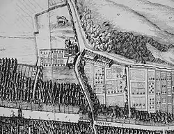 Изображение первого аптекарского сада (при церкви Тринити-колледжа) на карте Эдинбурга 1647 года. В настоящее время это место отмечено памятной доской на перроне городского вокзала Уэверли