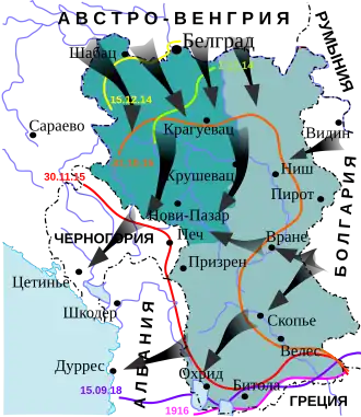 23 сентября 1915 года в войну на стороне Австро-Венгрии и Германии вступила Болгария, продолжающая претендовать на сербскую часть Македонии. В результате скоординированной атаки австрийских, германских и болгарских войск и несмотря на героическое сопротивление, в октябре 1915 года сербская армия была разбита на всех фронтах и с колоссальными потерями отступила через горы Албании к Адриатике. Её остатки были эвакуированы союзниками на Корфу. Территория Сербии была оккупирована австрийскими, германскими и болгарскими войсками.